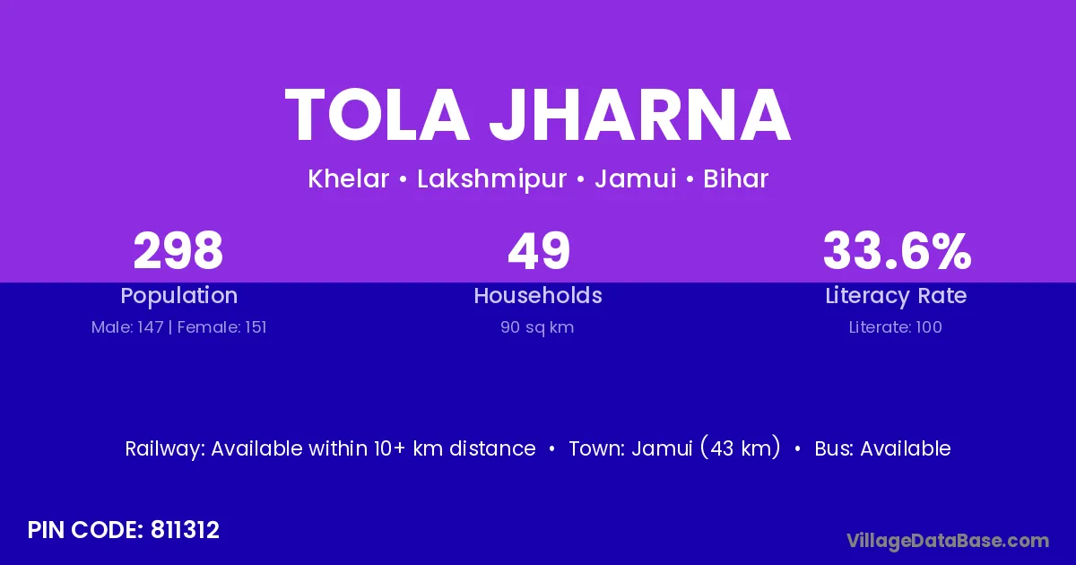 Jamui (43 km) is the nearest town to Tola Jharna village for major economic activities and is located approximately 43 km away.