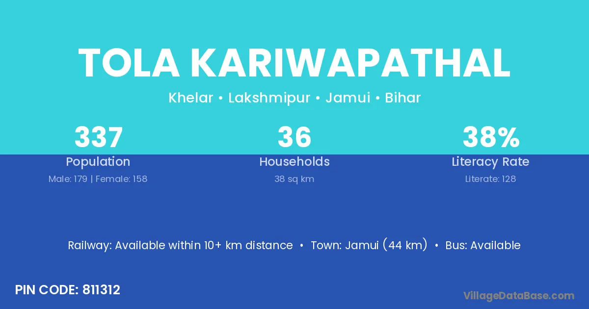 Jamui (44 km) is the nearest town to Tola Kariwapathal village for major economic activities and is located approximately 44 km away.