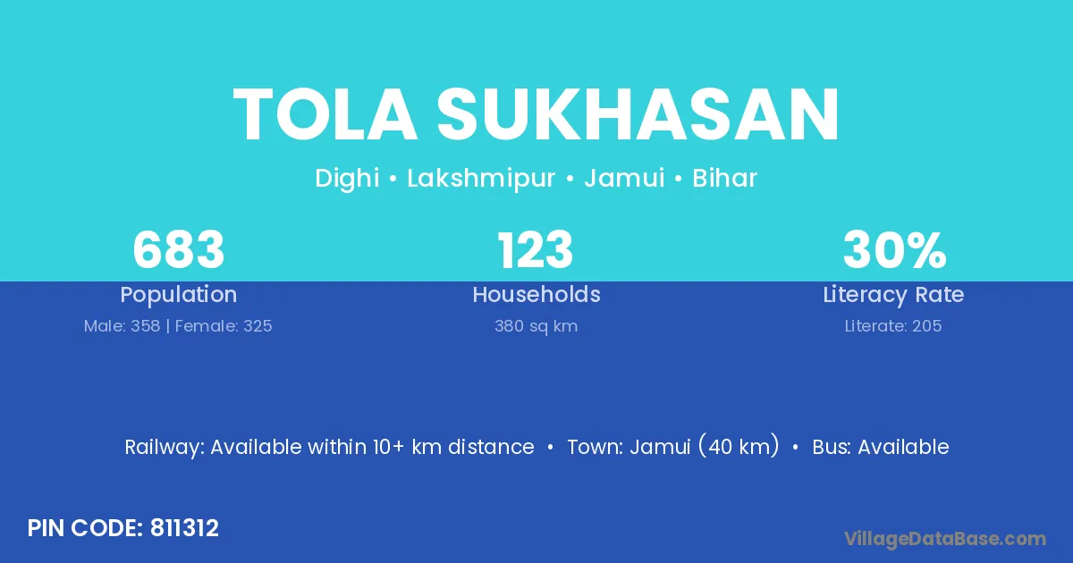 Jamui (40 km) is the nearest town to Tola Sukhasan village for major economic activities and is located approximately 40 km away.