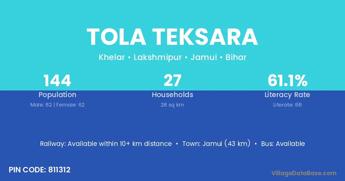 Jamui (43 km) is the nearest town to Tola Teksara village for major economic activities and is located approximately 43 km away.
