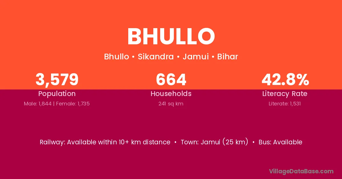 Jamui (25 km) is the nearest town to Bhullo village for major economic activities and is located approximately 25 km away.