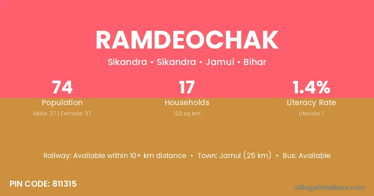 Jamui (25 km) is the nearest town to Ramdeochak village for major economic activities and is located approximately 25 km away.