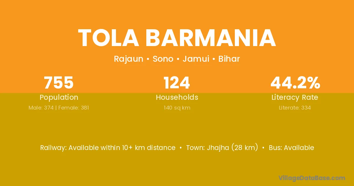 Jhajha (28 km) is the nearest town to Tola Barmania village for major economic activities and is located approximately 28 km away.
