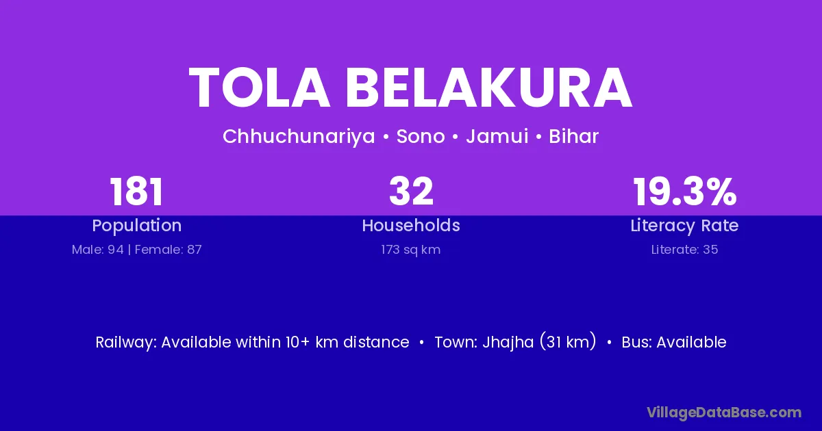 Jhajha (31 km) is the nearest town to Tola Belakura village for major economic activities and is located approximately 31 km away.