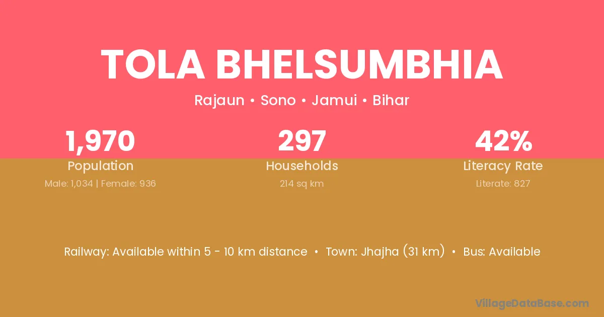 Jhajha (31 km) is the nearest town to Tola Bhelsumbhia village for major economic activities and is located approximately 31 km away.