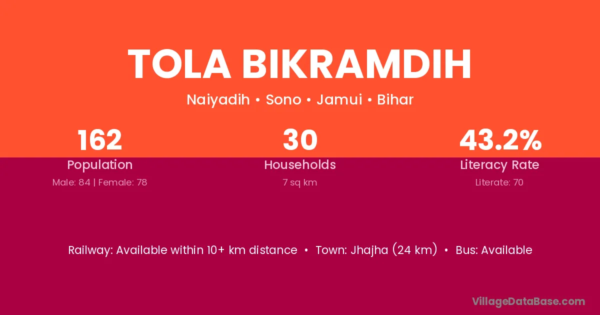 Jhajha (24 km) is the nearest town to Tola Bikramdih village for major economic activities and is located approximately 24 km away.