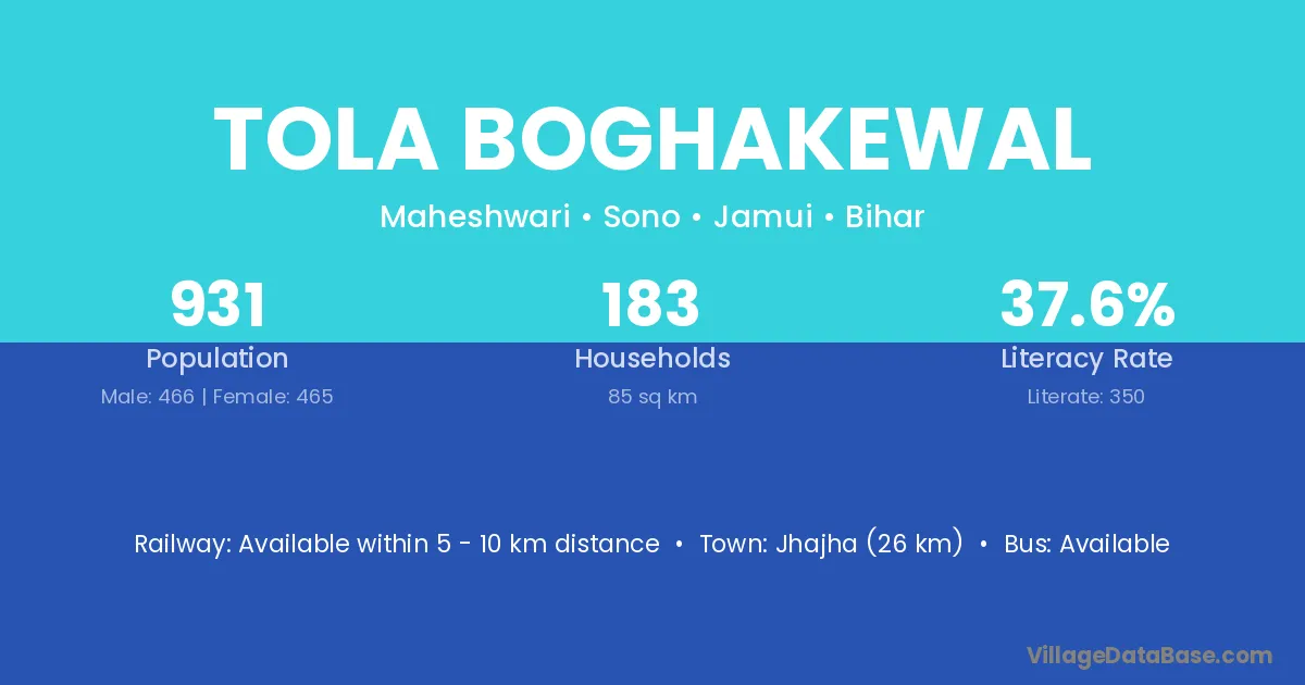 Jhajha (26 km) is the nearest town to Tola Boghakewal village for major economic activities and is located approximately 26 km away.