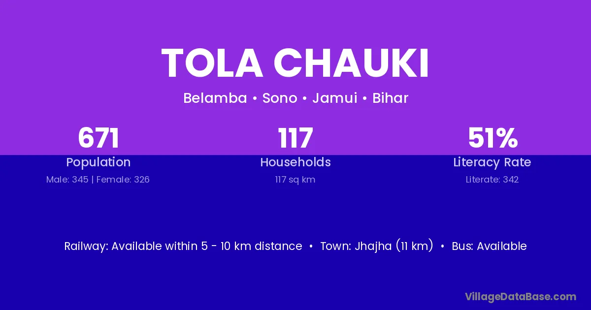 Jhajha (11 km) is the nearest town to Tola Chauki village for major economic activities and is located approximately 11 km away.