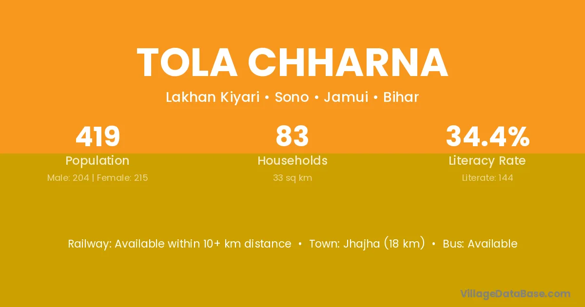 Jhajha (18 km) is the nearest town to Tola Chharna village for major economic activities and is located approximately 18 km away.