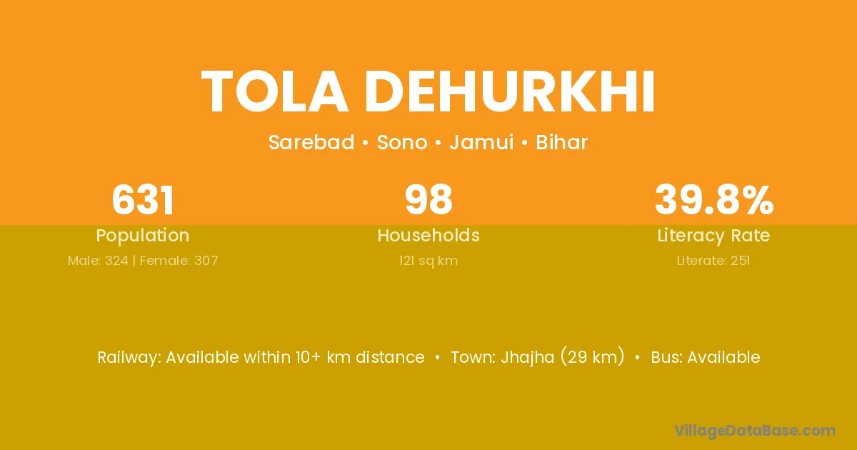 Jhajha (29 km) is the nearest town to Tola Dehurkhi village for major economic activities and is located approximately 29 km away.