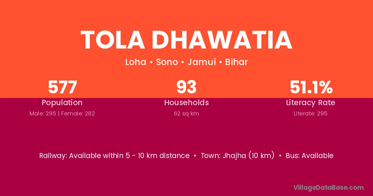 Jhajha (10 km) is the nearest town to Tola Dhawatia village for major economic activities and is located approximately 10 km away.