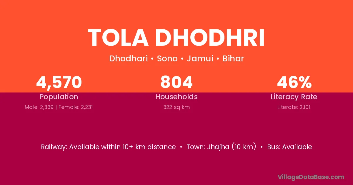 Jhajha (10 km) is the nearest town to Tola Dhodhri village for major economic activities and is located approximately 10 km away.
