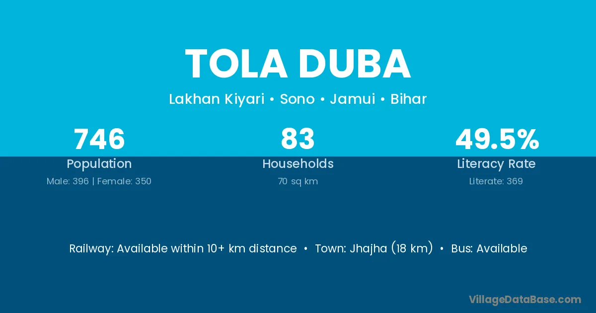 Jhajha (18 km) is the nearest town to Tola Duba village for major economic activities and is located approximately 18 km away.