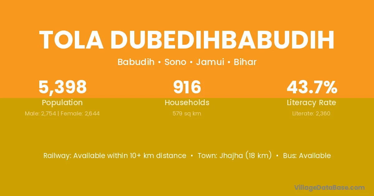 Jhajha (18 km) is the nearest town to Tola Dubedihbabudih village for major economic activities and is located approximately 18 km away.