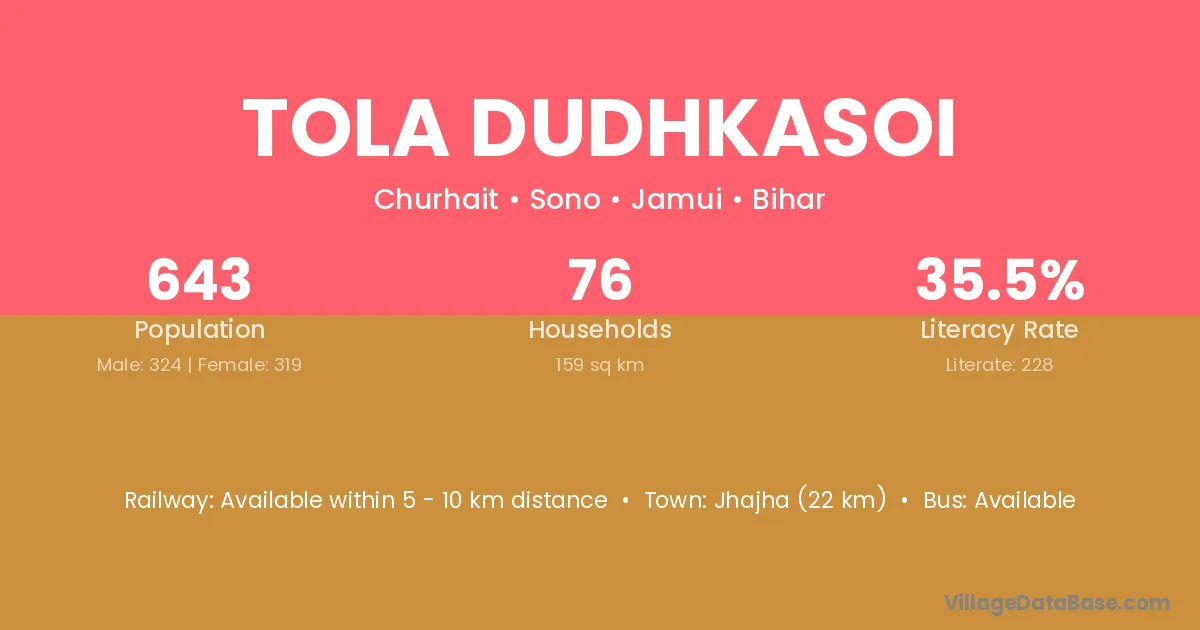 Jhajha (22 km) is the nearest town to Tola Dudhkasoi village for major economic activities and is located approximately 22 km away.