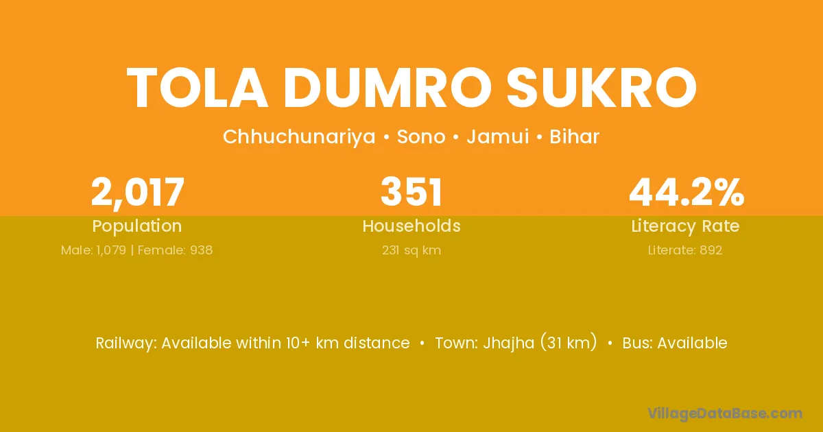 Jhajha (31 km) is the nearest town to Tola Dumro Sukro village for major economic activities and is located approximately 31 km away.