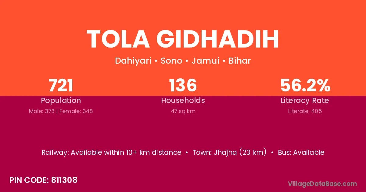 Jhajha (23 km) is the nearest town to Tola Gidhadih village for major economic activities and is located approximately 23 km away.