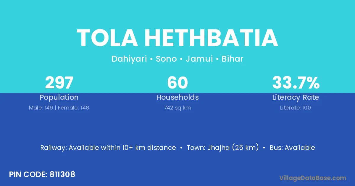 Jhajha (25 km) is the nearest town to Tola Hethbatia village for major economic activities and is located approximately 25 km away.