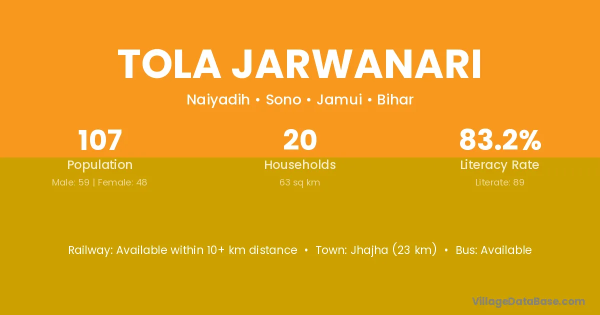 Jhajha (23 km) is the nearest town to Tola Jarwanari village for major economic activities and is located approximately 23 km away.