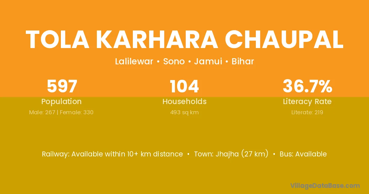 Jhajha (27 km) is the nearest town to Tola Karhara Chaupal village for major economic activities and is located approximately 27 km away.