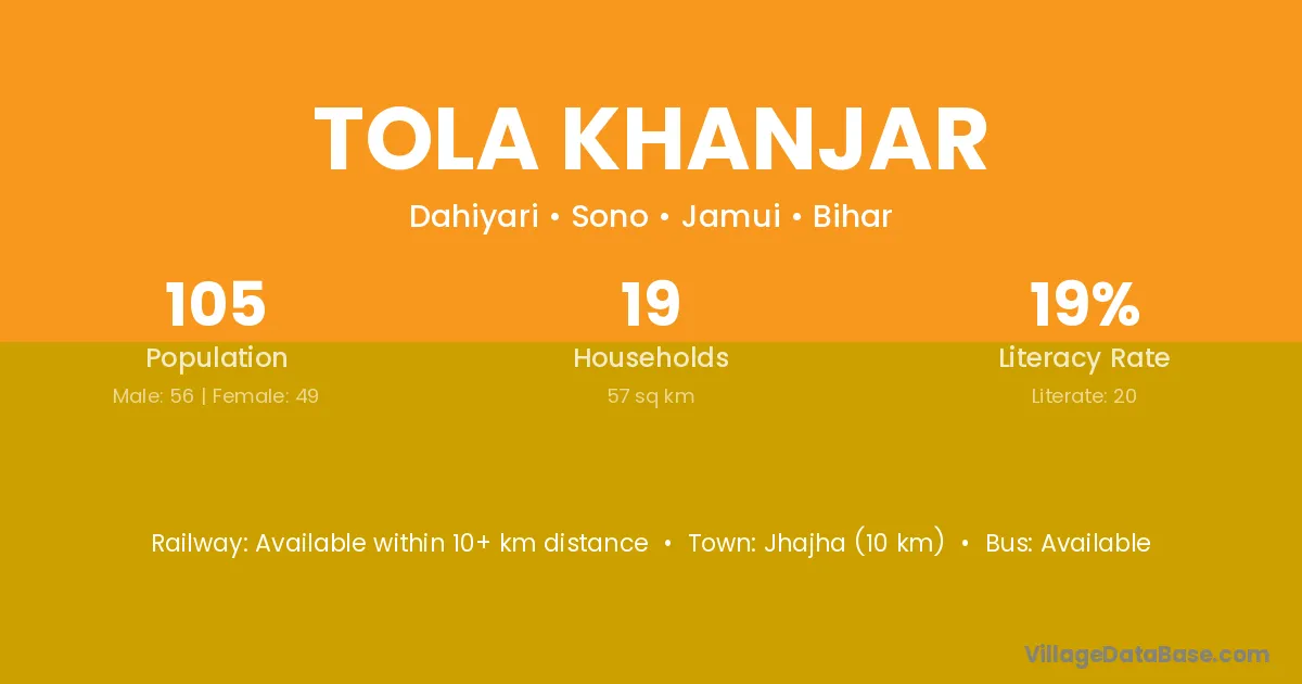 Jhajha (10 km) is the nearest town to Tola Khanjar village for major economic activities and is located approximately 10 km away.