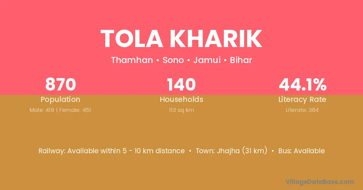 Jhajha (31 km) is the nearest town to Tola Kharik village for major economic activities and is located approximately 31 km away.