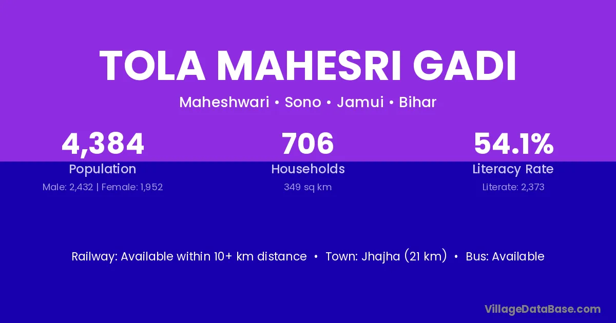 Jhajha (21 km) is the nearest town to Tola Mahesri Gadi village for major economic activities and is located approximately 21 km away.