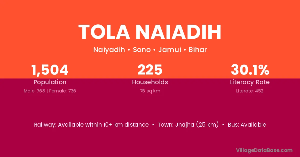 Jhajha (25 km) is the nearest town to Tola Naiadih village for major economic activities and is located approximately 25 km away.