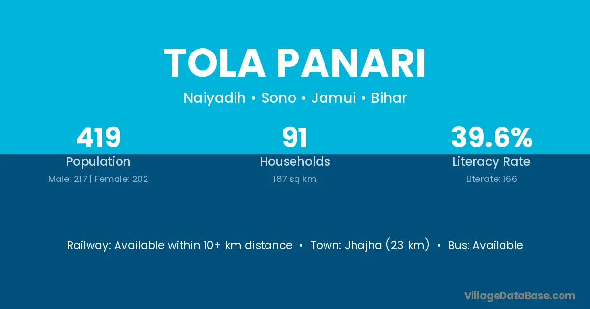 Jhajha (23 km) is the nearest town to Tola Panari village for major economic activities and is located approximately 23 km away.