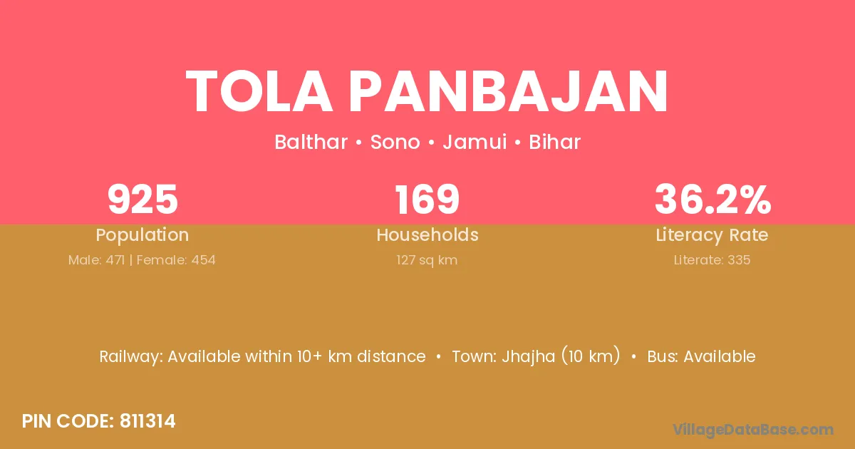 Jhajha (10 km) is the nearest town to Tola Panbajan village for major economic activities and is located approximately 10 km away.