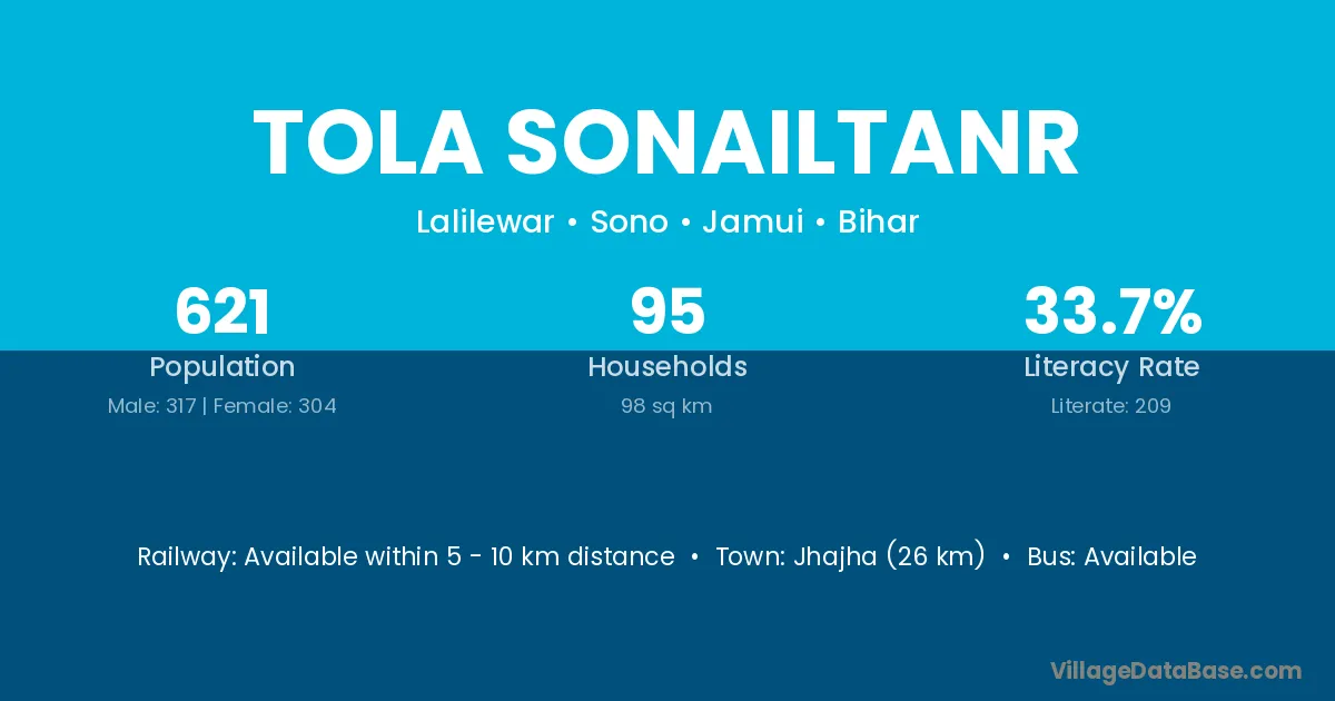 Jhajha (26 km) is the nearest town to Tola Sonailtanr village for major economic activities and is located approximately 26 km away.