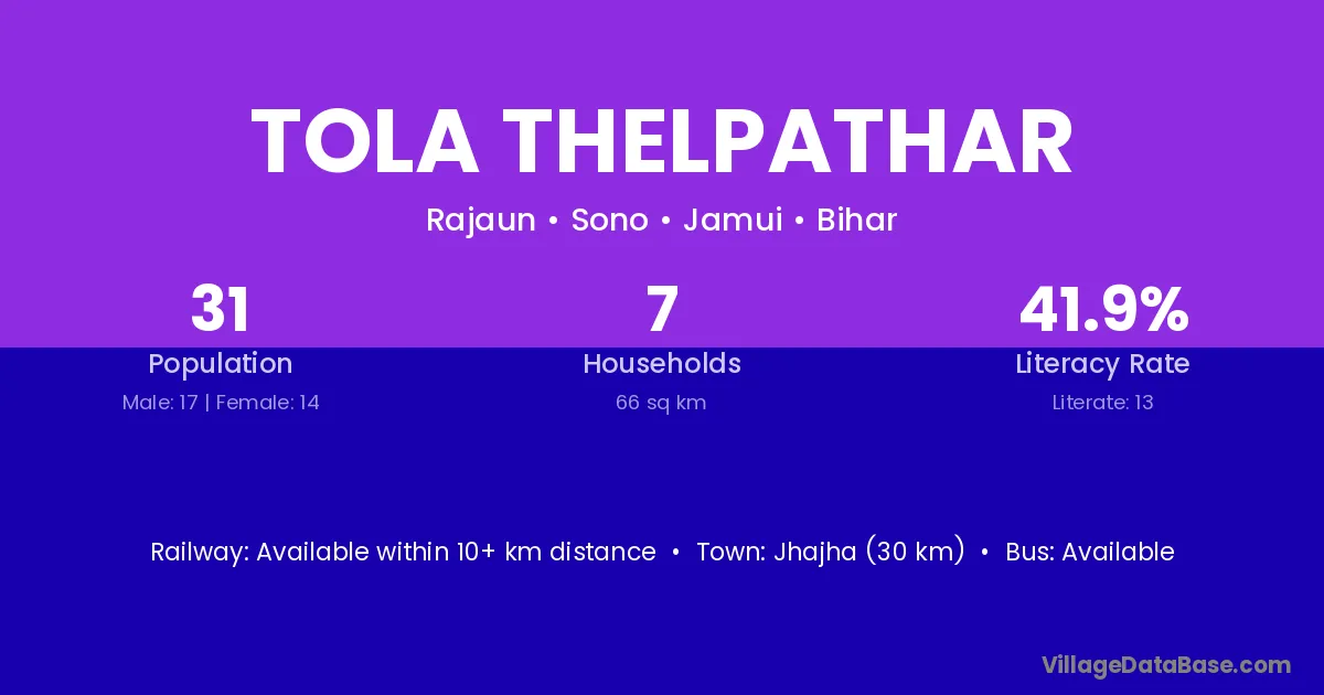 Jhajha (30 km) is the nearest town to Tola Thelpathar village for major economic activities and is located approximately 30 km away.
