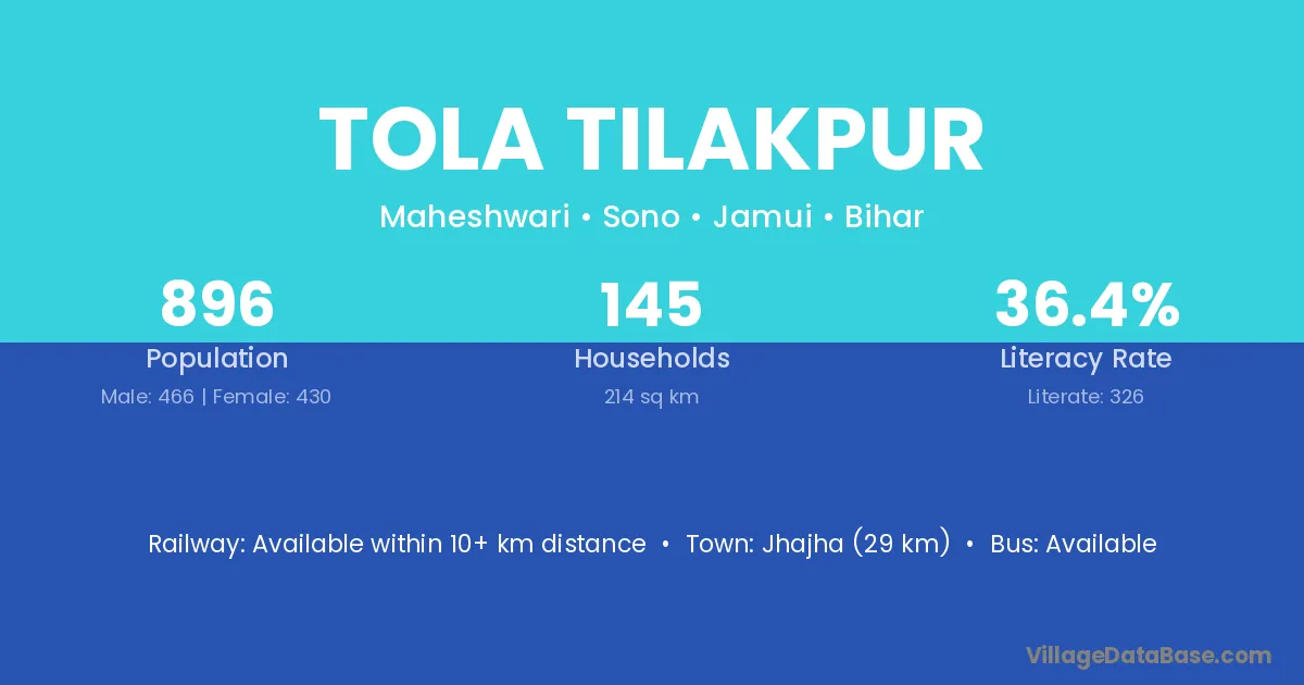 Jhajha (29 km) is the nearest town to Tola Tilakpur village for major economic activities and is located approximately 29 km away.