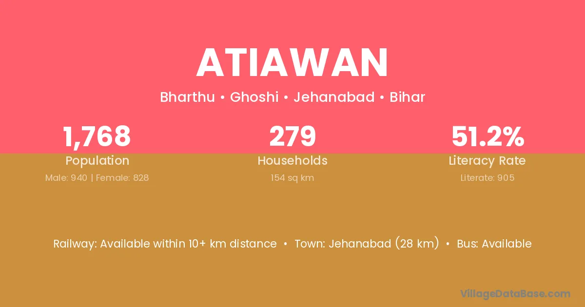 Jehanabad (28 km) is the nearest town to Atiawan village for major economic activities and is located approximately 28 km away.
