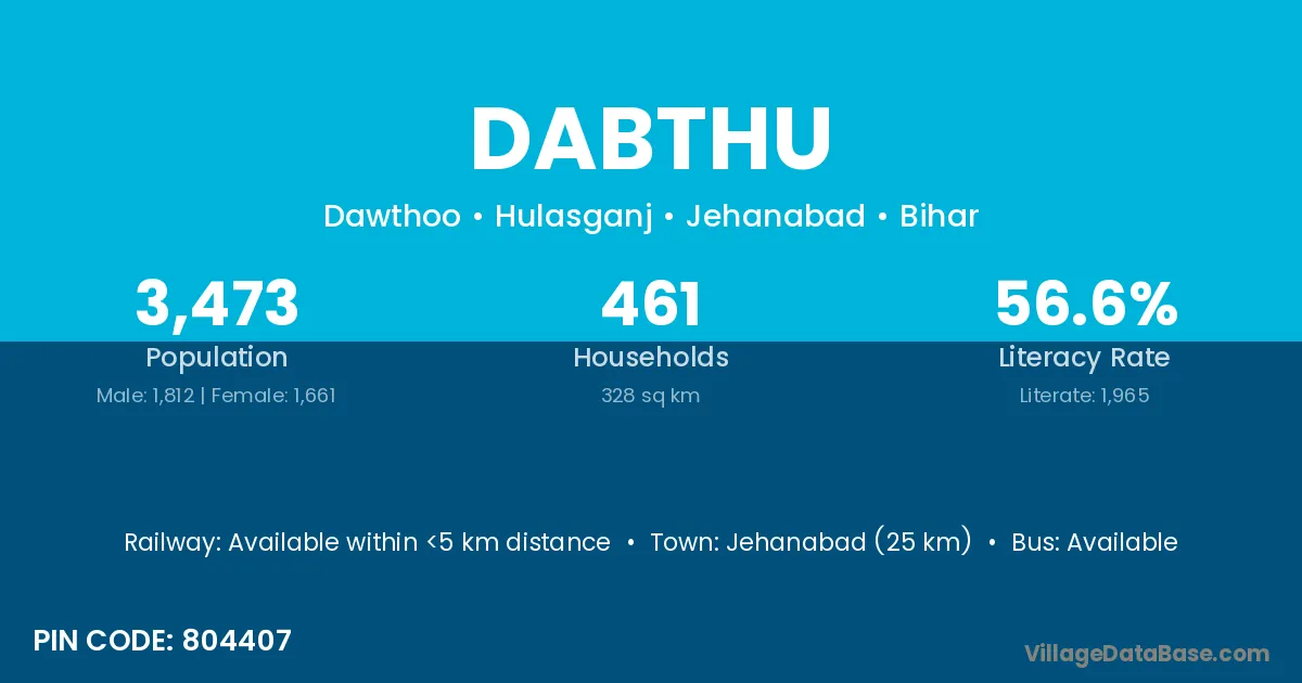 Jehanabad (25 km) is the nearest town to Dabthu village for major economic activities and is located approximately 25 km away.