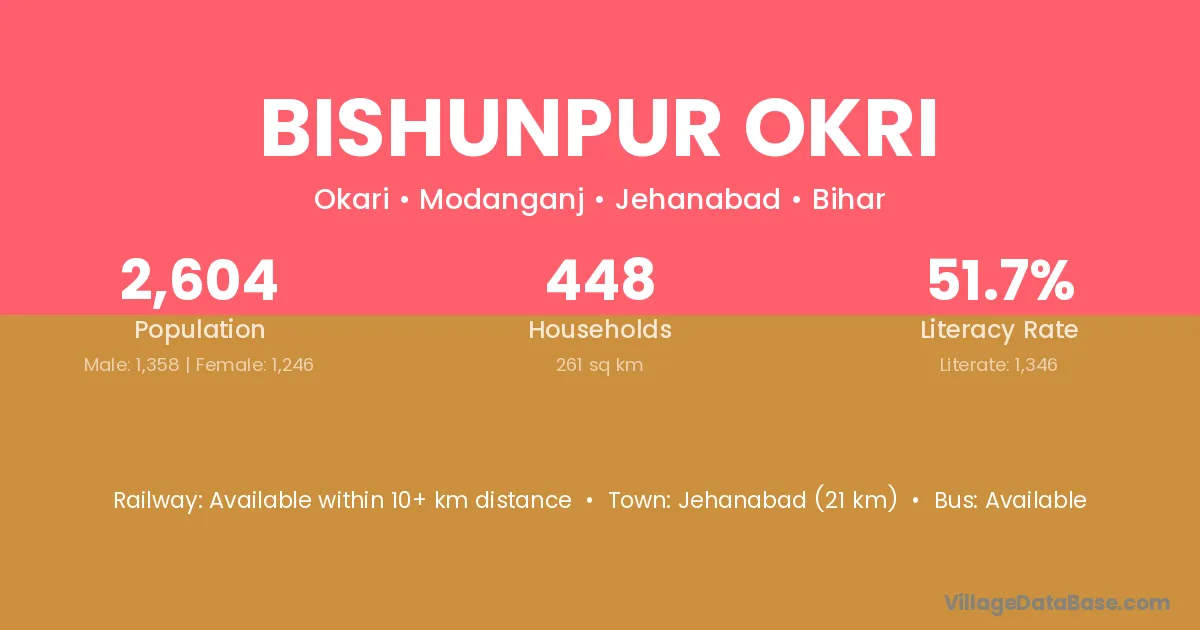 Jehanabad (21 km) is the nearest town to Bishunpur Okri village for major economic activities and is located approximately 21 km away.
