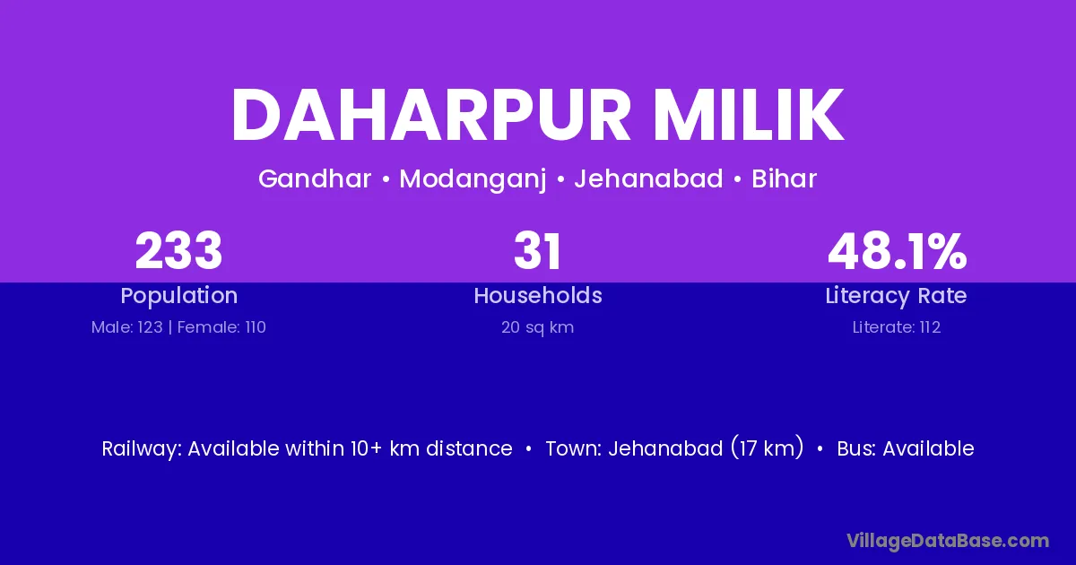 Jehanabad (17 km) is the nearest town to Daharpur Milik village for major economic activities and is located approximately 17 km away.