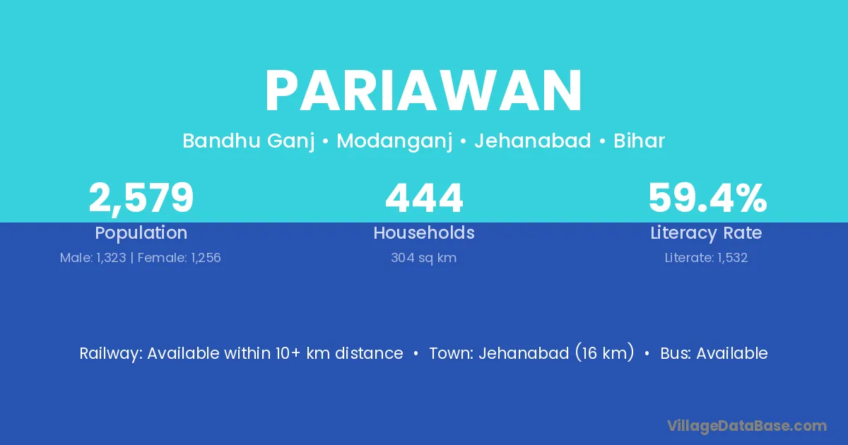 Jehanabad (16 km) is the nearest town to Pariawan village for major economic activities and is located approximately 16 km away.