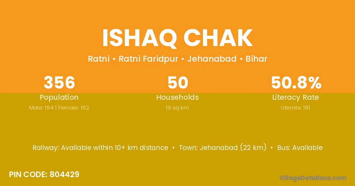 Jehanabad (22 km) is the nearest town to Ishaq Chak village for major economic activities and is located approximately 22 km away.