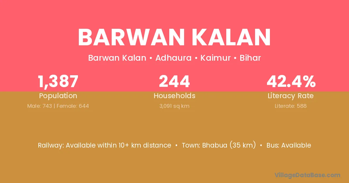 Bhabua (35 km) is the nearest town to Barwan Kalan village for major economic activities and is located approximately 35 km away.