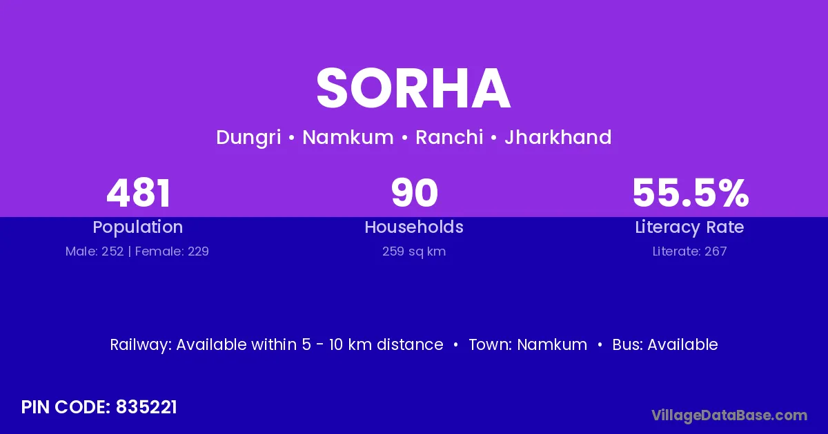 The literacy rate of Sorha village is 26.88%. Male literacy stands at 35.11% and female literacy at 17.60%.