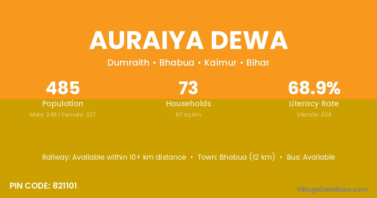 Auraiya Dewa village has a total population of 485 people, of which 248 are males and 237 are females.