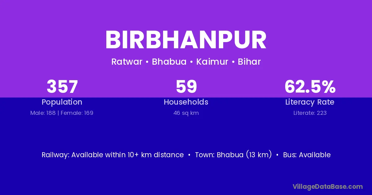 Bhabua (13 km) is the nearest town to Birbhanpur village for major economic activities and is located approximately 13 km away.