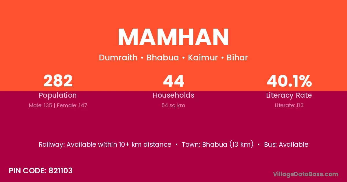 Bhabua (13 km) is the nearest town to Mamhan village for major economic activities and is located approximately 13 km away.