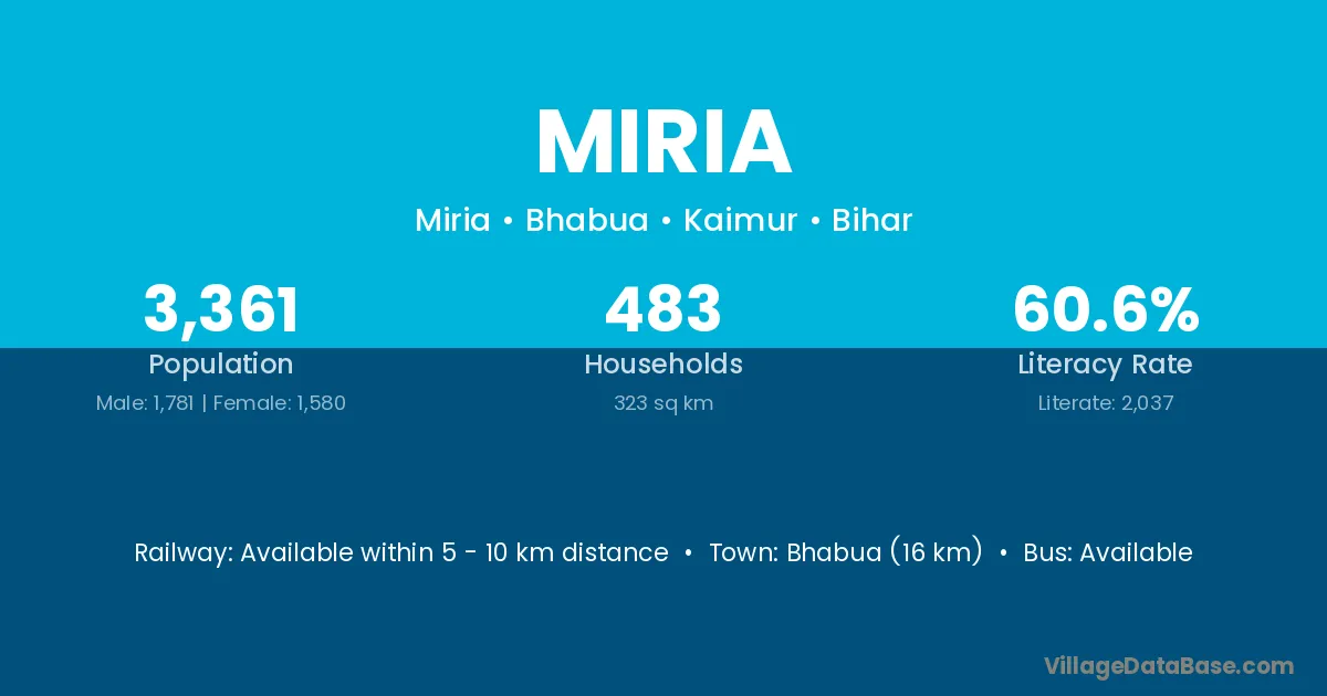 Bhabua (16 km) is the nearest town to Miria village for major economic activities and is located approximately 16 km away.