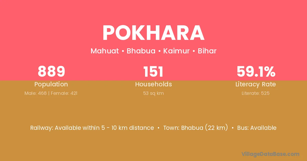 Bhabua (22 km) is the nearest town to Pokhara village for major economic activities and is located approximately 22 km away.