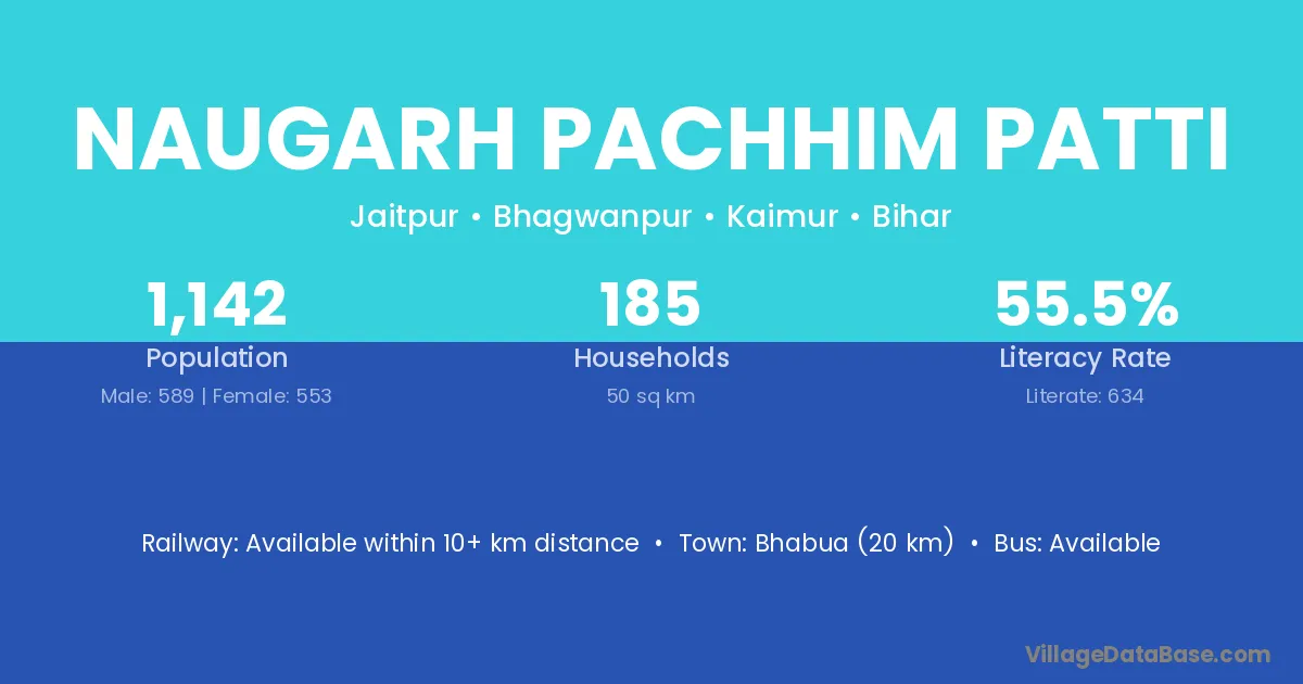 Bhabua (20 km) is the nearest town to Naugarh Pachhim Patti village for major economic activities and is located approximately 20 km away.