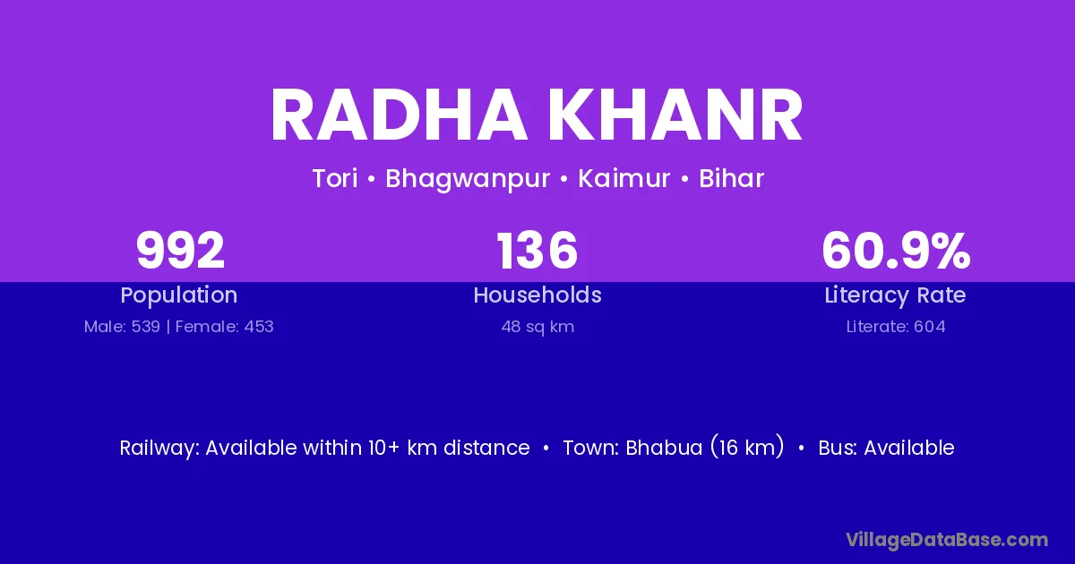 Bhabua (16 km) is the nearest town to Radha Khanr village for major economic activities and is located approximately 16 km away.