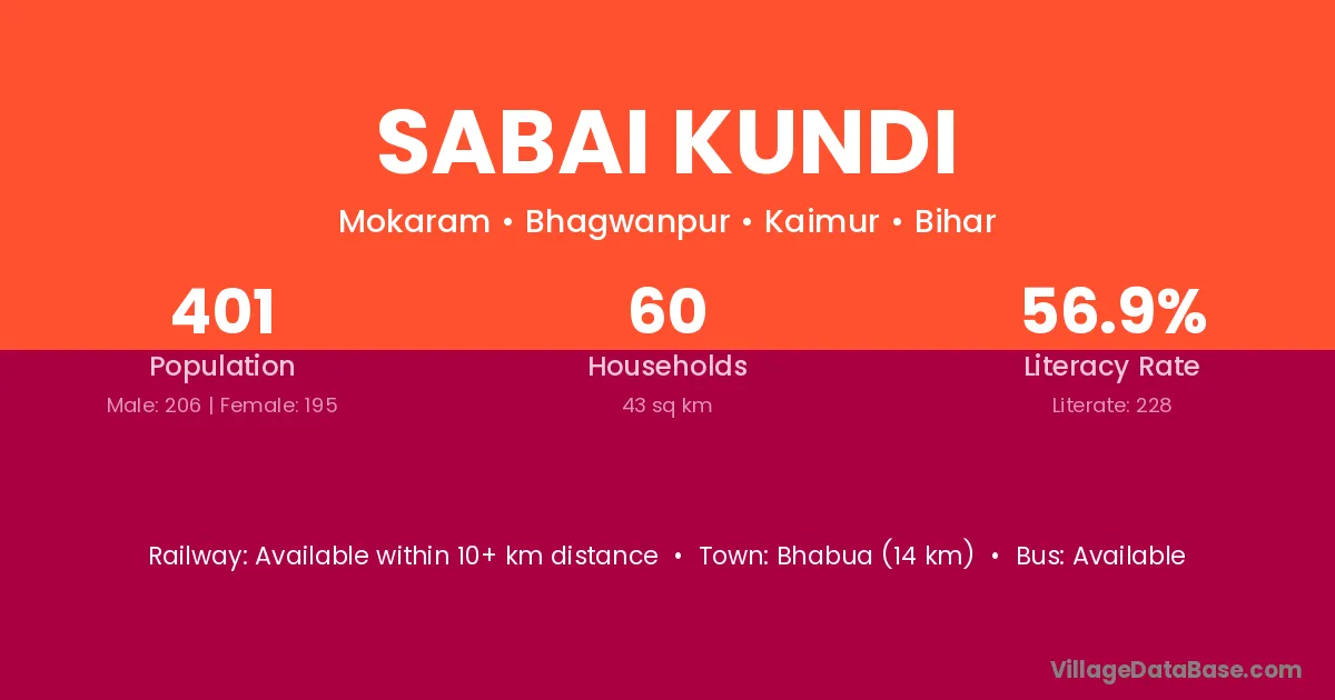 Sabai Kundi village has a total population of 401 people, of which 206 are males and 195 are females.