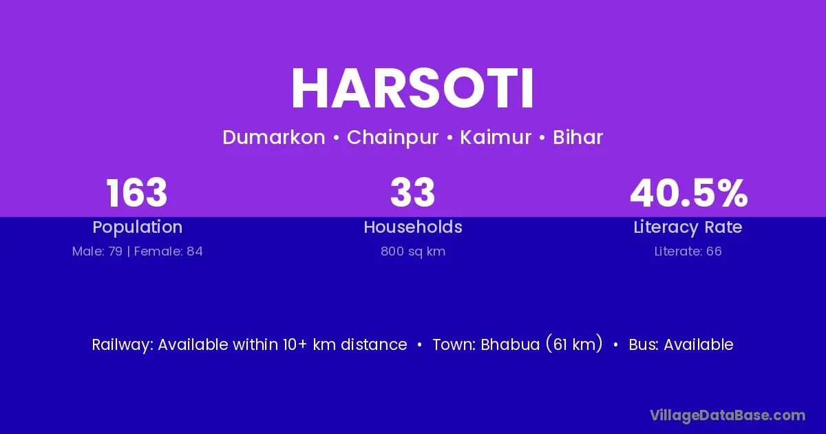 Bhabua (61 km) is the nearest town to Harsoti village for major economic activities and is located approximately 61 km away.